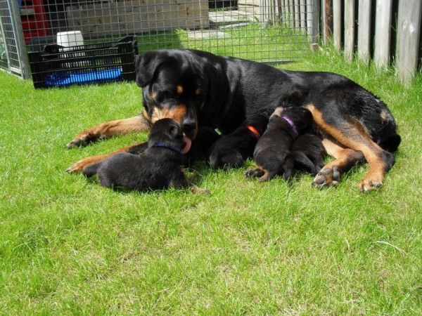Zõe heeft het mooi verdeeld!! De moeder en pups doen het goed!!