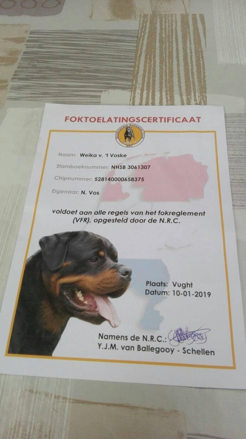 Yes! De fokkaart van Weika van 't Voske (Ziva van 't Voske x Django vom Rottberg) is binnen dat betekend dat Weika aan alle eissen van de NRC voldoet en we te zijne tijd weer een nestje mogen fokken met een leuke werkreu!